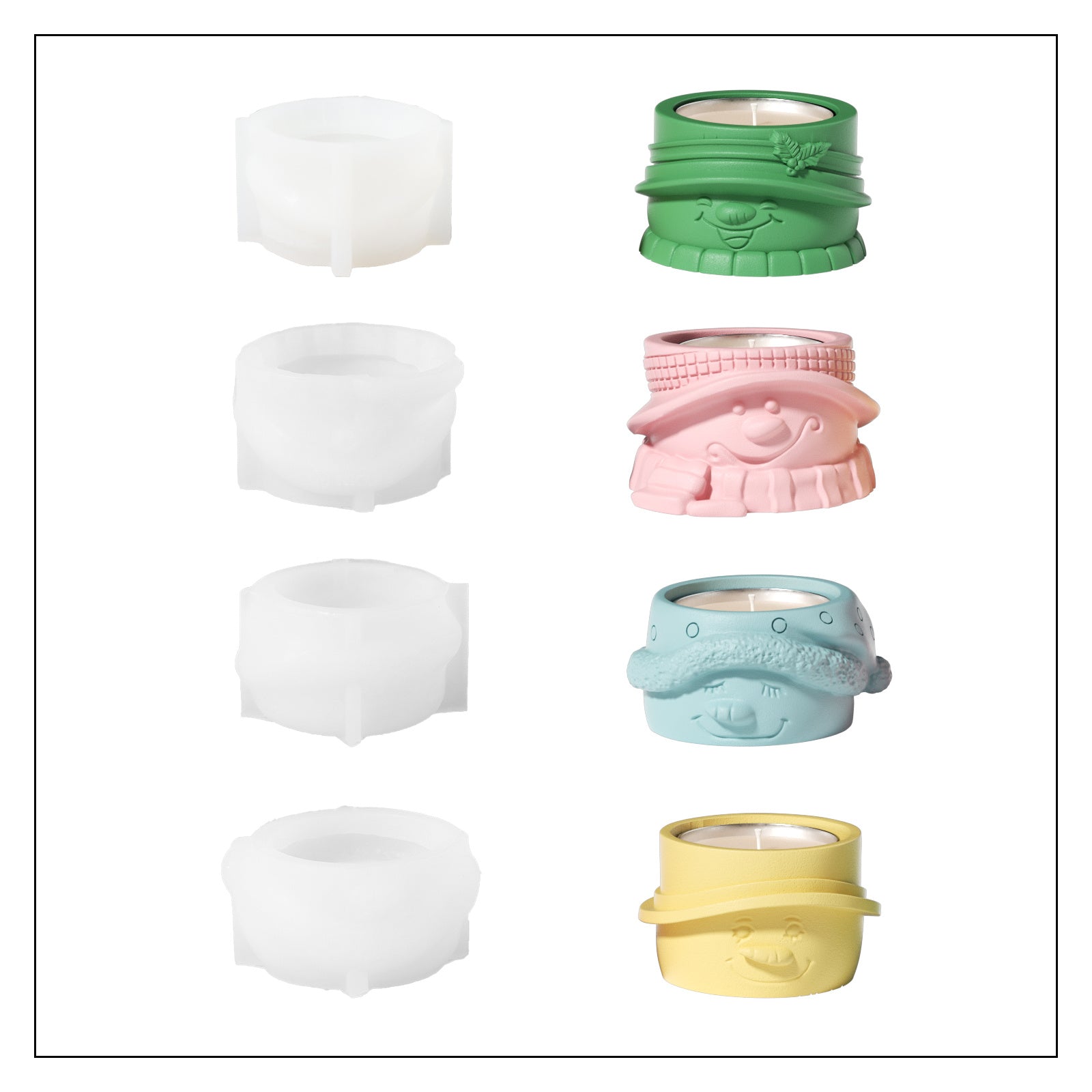 اختبر سحر عيد الميلاد مع قالب السيليكون لحامل شمعة الرجل الثلجي! اصنع شموعًا بشكل رجل ثلج مفصلة بشكل جميل لإضاءة منزلك ونشر بهجة العطلات. الإضافة المثالية لزينة عيد الميلاد الخاصة بك، سيجعل هذا القالب عملية صنع الشموع ممتعة وسهلة.