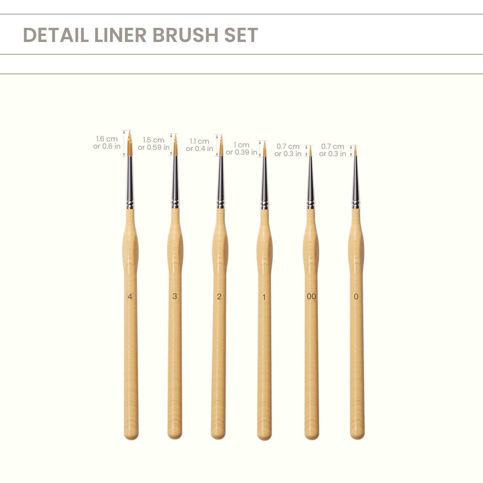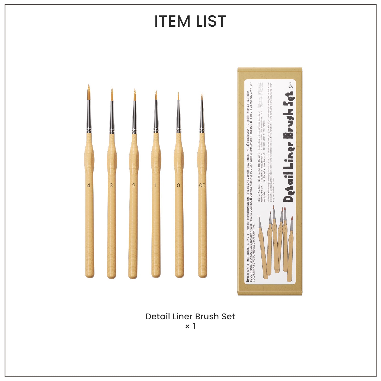 Includes:6 brushes (sizes 00, 0, 1, 2, 3, 4)