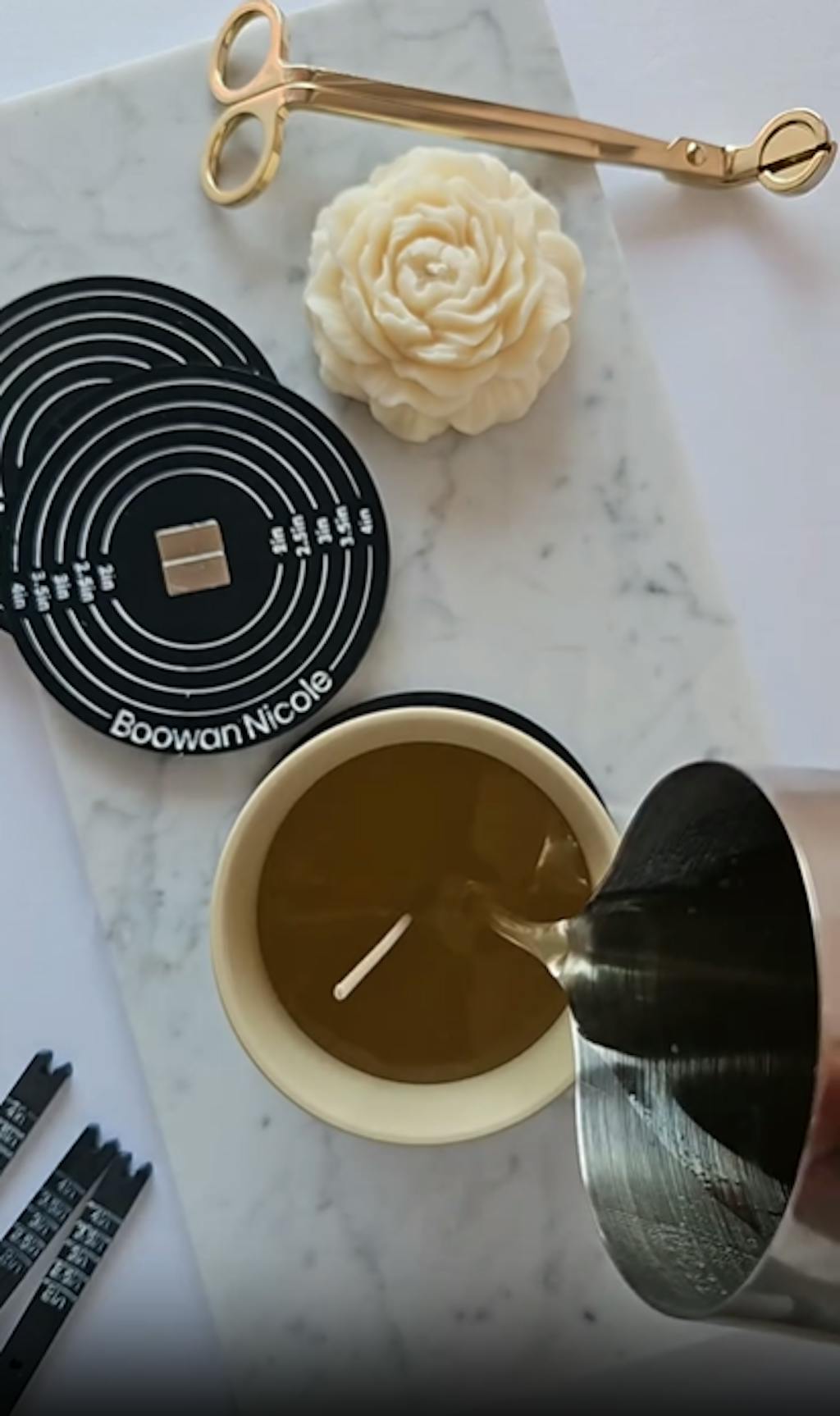 Revolutionize your candle-making with our innovative and user friendly tool. Designed for both beginners and experts, it ensures effortless, precise wick positioning and stability, compatible with various materials such as Boowannite, Jesmonite, gypsum, cement, silicone, glass, and metal. After placing the wick in the candle jar, gently nudge it by hand for precise center alignment.
