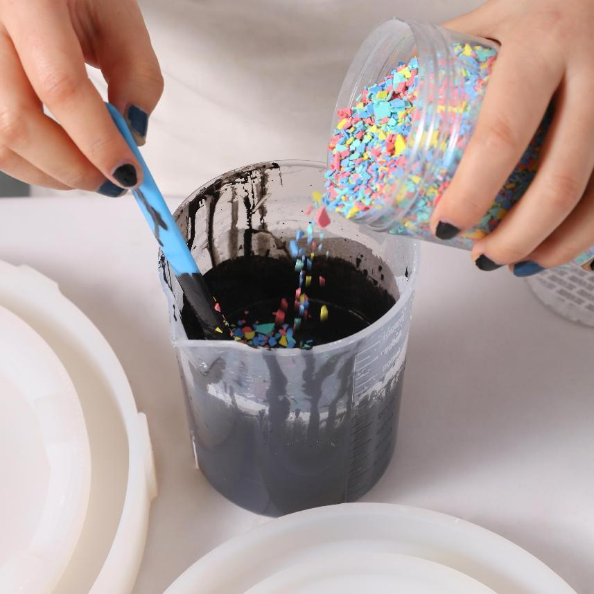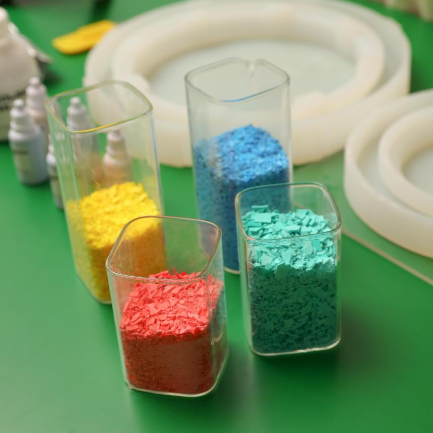 Step 7: Crumble the solidified material and collect the pieces into a container. You can make more pieces like this in different colors, the more colors the better they look.