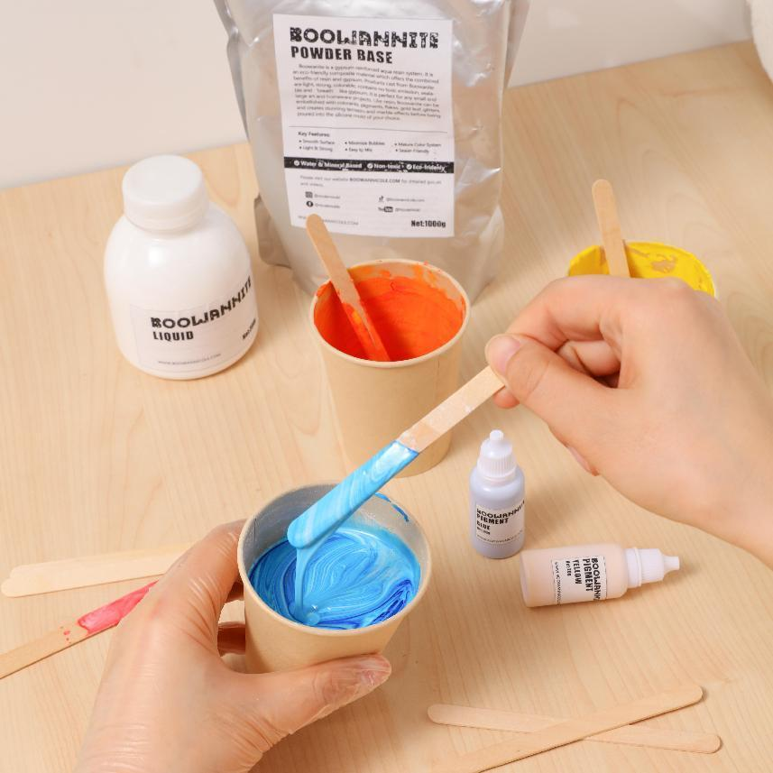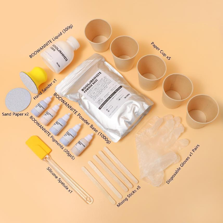 Boowannite kit* including a Boowannite powder base, a Boowannite liquid, 5 pigments, a sander, a silicone spatula, 2 sandpaper, 5 paper cups, 5 wooden sticks, and a pair of gloves (as shown in the picture below)