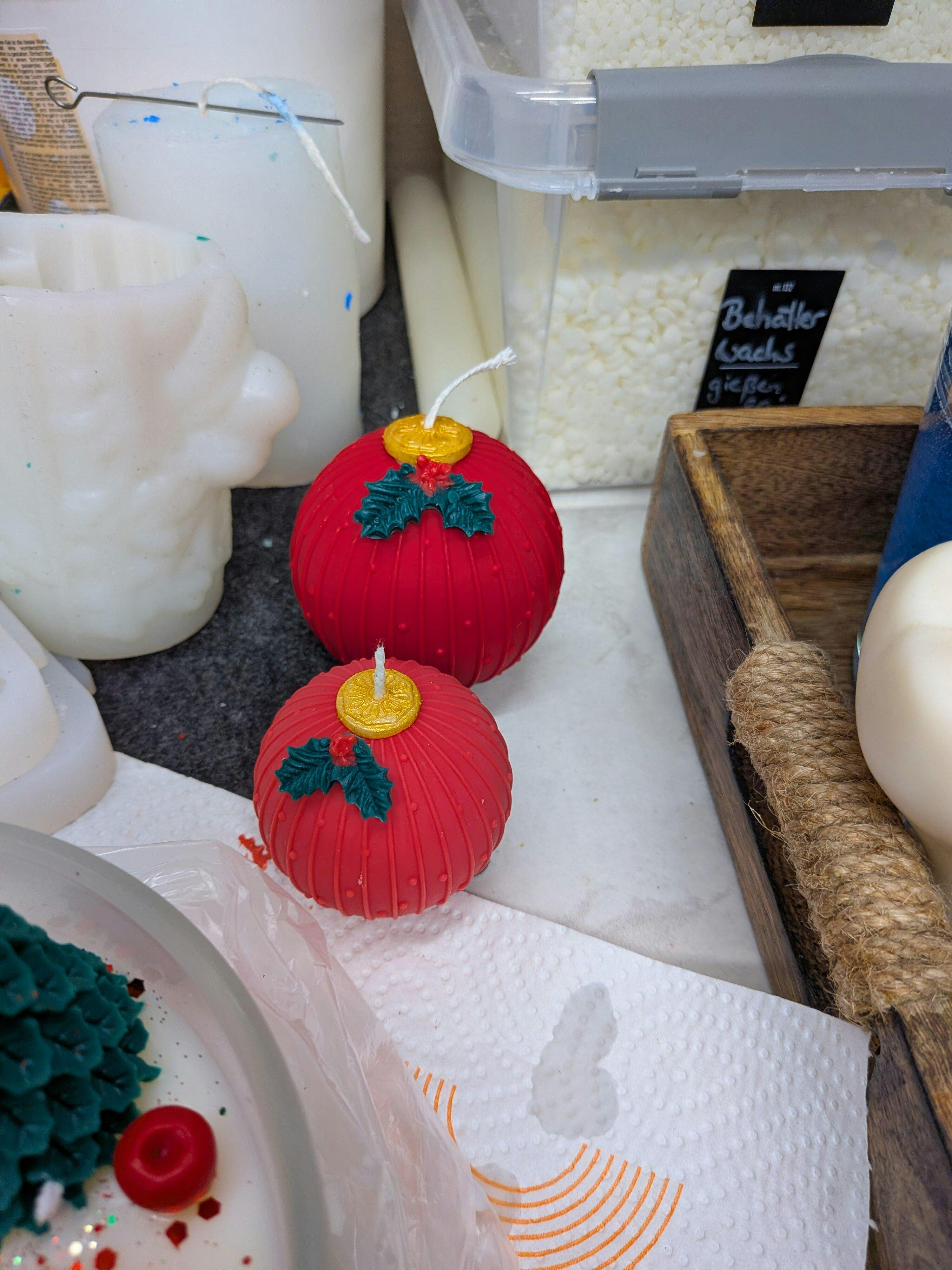 Vela de bola navideña Starlit Dots (misma forma en tres tamaños S/M/L): una bola redondeada con costillas verticales espaciadas uniformemente y textura de "estrella" punteada, rematada con una tapa vintage. Viene con moldes de accesorios decorativos y barniz para velas en oro y plata—aplica un brillo total, luego resalta las costillas y puntos para una superficie clara y brillante con acentos metálicos.