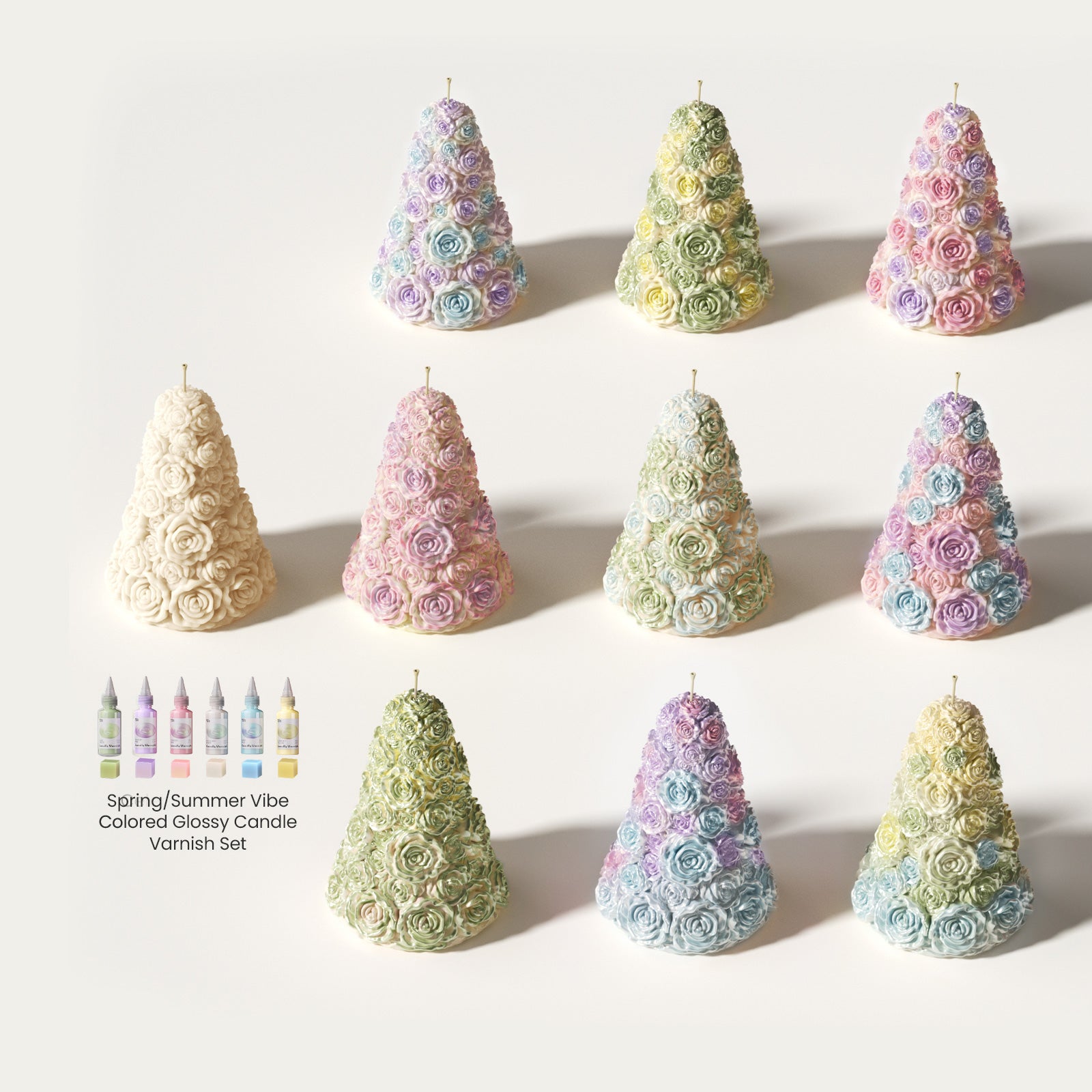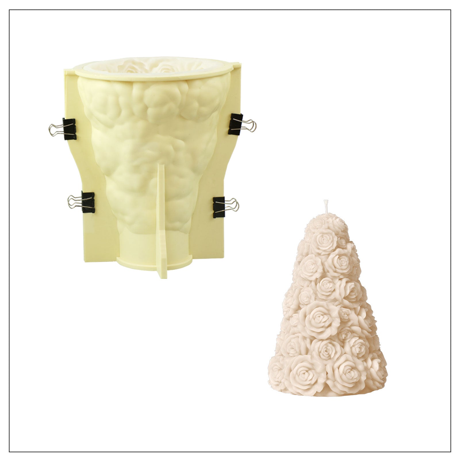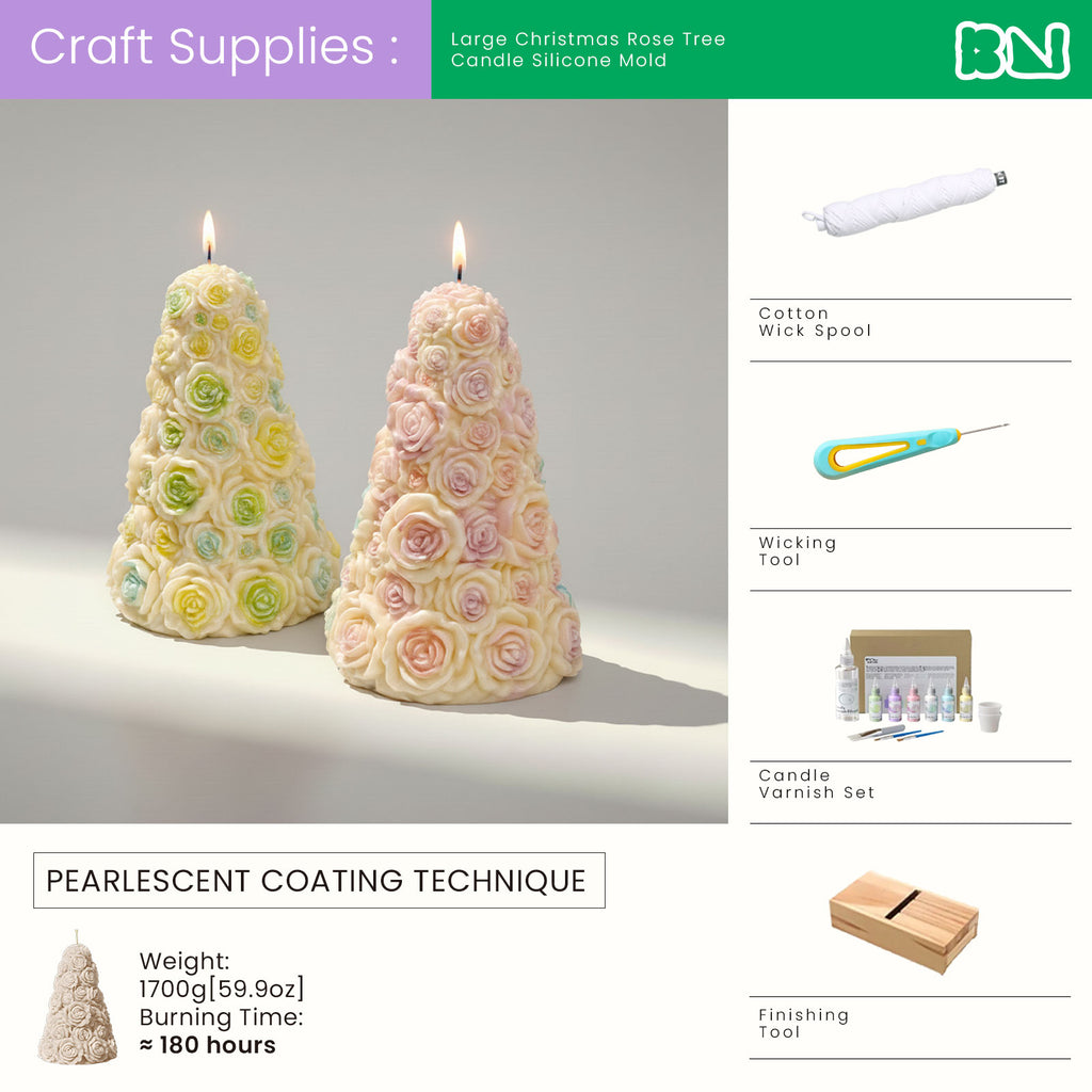 Plant a whole forest of glowing roses for your next celebration.The Rose Tree Candle Silicone Mold Collection lets you cast cone-shaped candles completely covered in sculpted roses—like bouquets stacked into trees. Cluster all three sizes together on a table and they turn into a blooming landscape: petals catching the candlelight, bubbles rising in champagne glasses, and a soft, cozy glow wrapping around flowers, plates, and conversation.