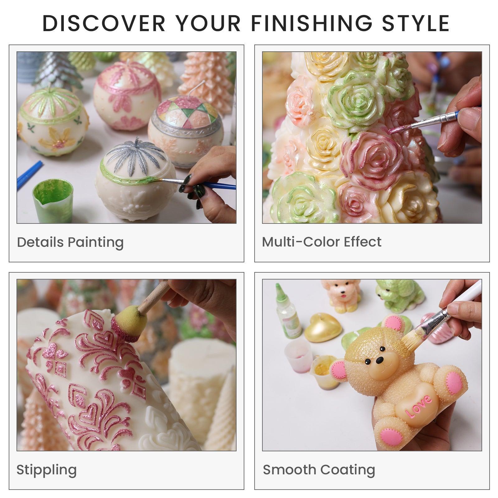 The Colored Glossy Candle Varnish is made from water-based varnish blended with natural mineral pigments. Designed for artistic surface finishing, it delivers a smooth, luminous effect with strong adhesion and fast drying. Safe for burning—non-flammable, odorless, and smoke-free when the candle is lit.