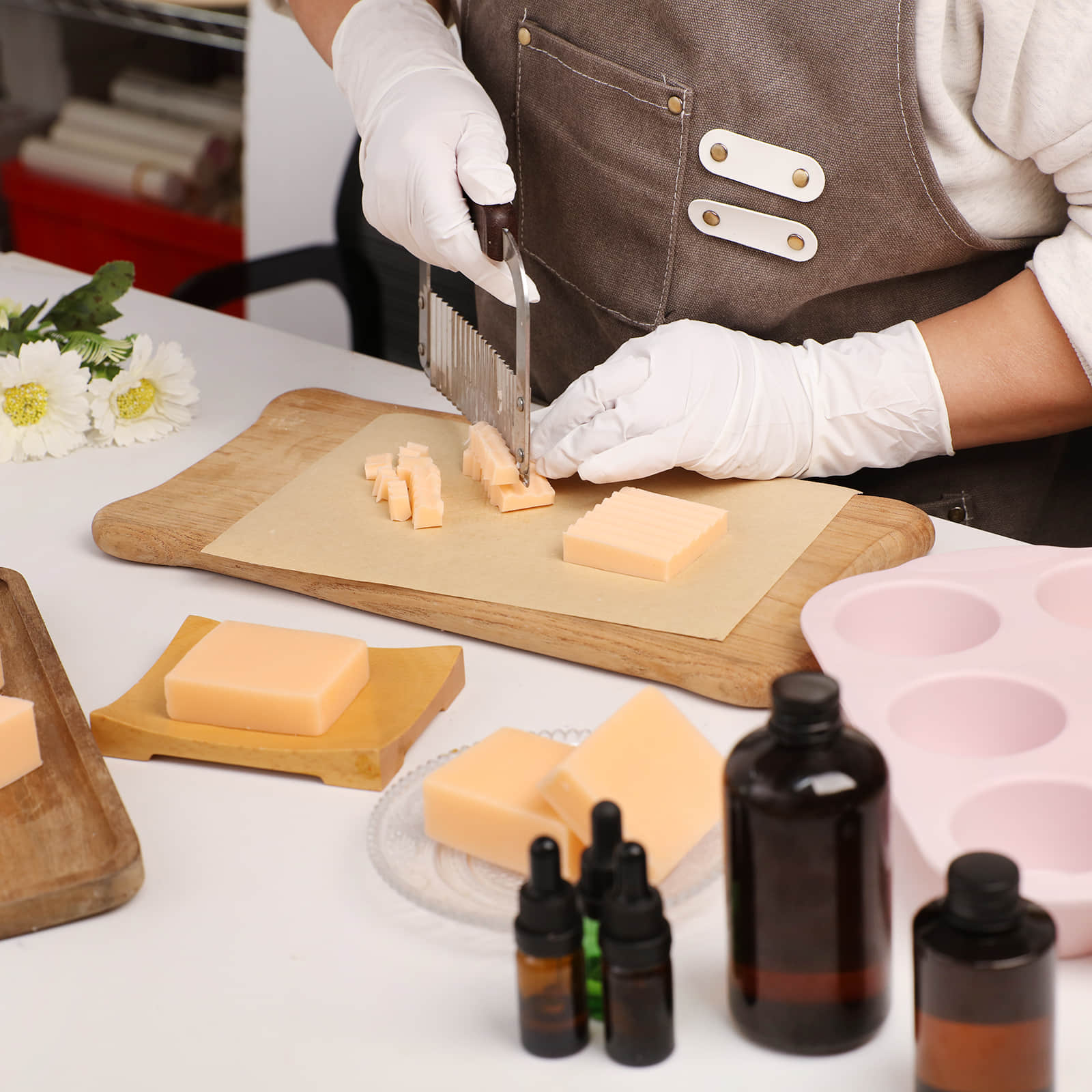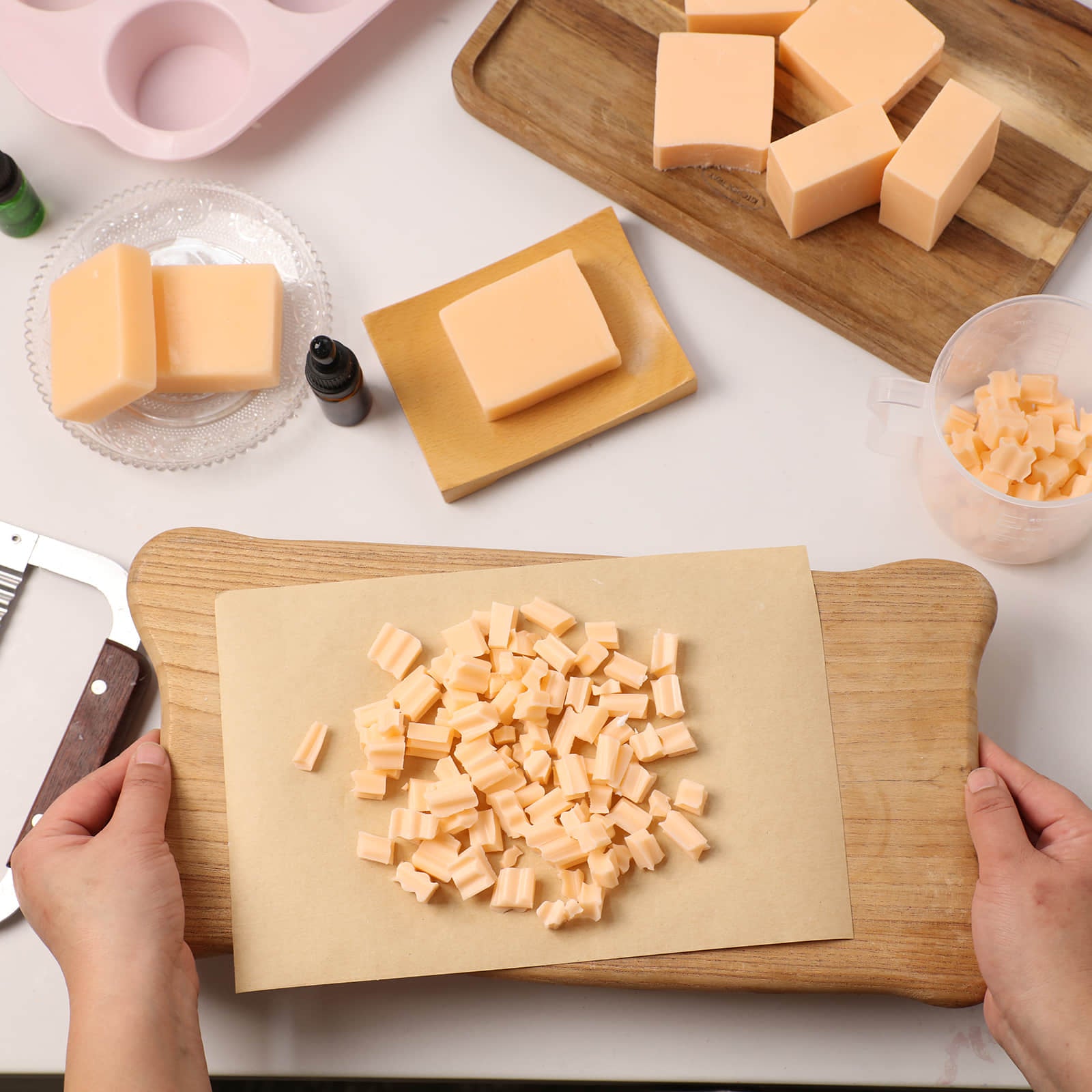 - Cut: Cut the soap base into small cubes (2–3 cm) to ensure even melting.